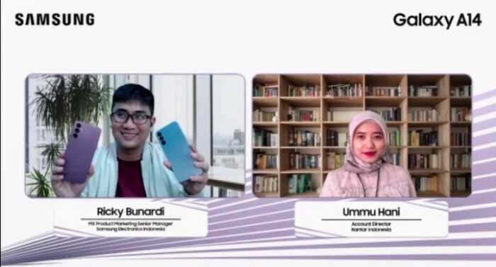 – SAMSUNG GALAXY A14 – MX Product Marketing Senior Manager Samsung Electronics Indonesia, Ricky Bunardi (kiri), menunjukkan produk terbaru Samsung Galaxy A14 kepada awak media secara online, Rabu (8/3/2023). Foto : ist/metrosemarang.com