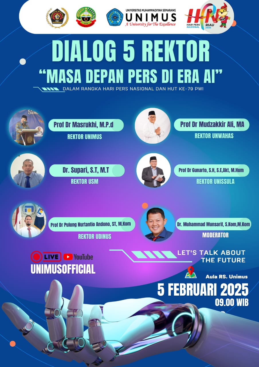METROSEMARANG.COM, SEMARANG – Dialog Rektor yang mengusung tajuk ”Masa Depan Pers di Era AI” dalam memperingati Hari Pers Nasional (HPN) 2025 Tingkat Jateng akan digelar di Aula RS Universitas Muhammadiyah Semarang (Unimus), Rabu besok 5 Februari 2025 mulai pukul 09.00 WIB.