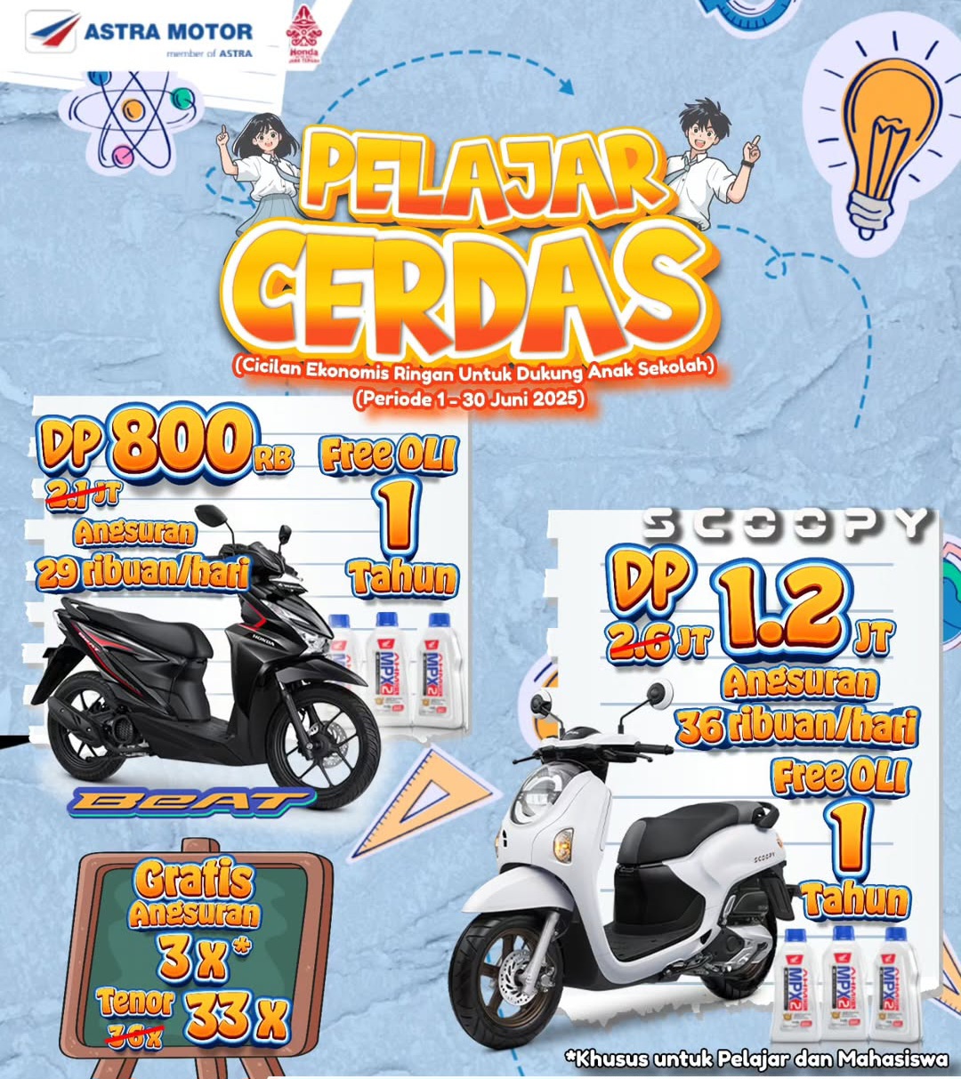 Berdasarkan informasi yang dihimpun dari akun Instagram resmi @hondajateng dan situs web resmi Honda Jawa Tengah, promo Scoopy untuk pelajar ini mencakup beberapa penawaran menarik: