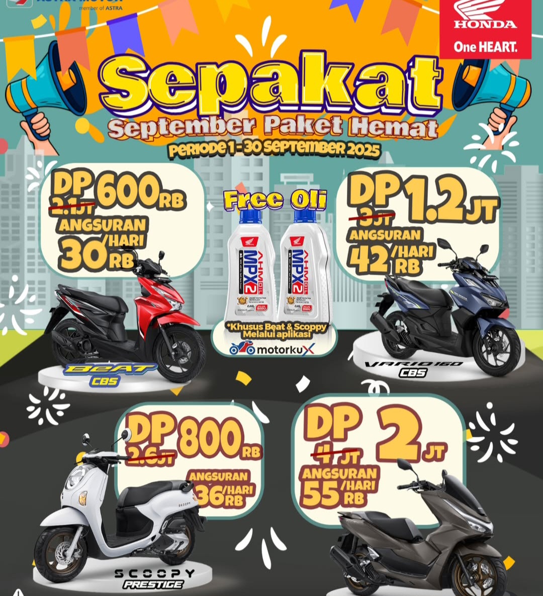 Dikutip dari Instagram resmi @hondajateng, PT Astra Honda Motor Jateng menghadirkan promo spesial bertajuk “Sepakat” (September Paket Hemat) yang berlangsung selama periode 1–30 September 2025.