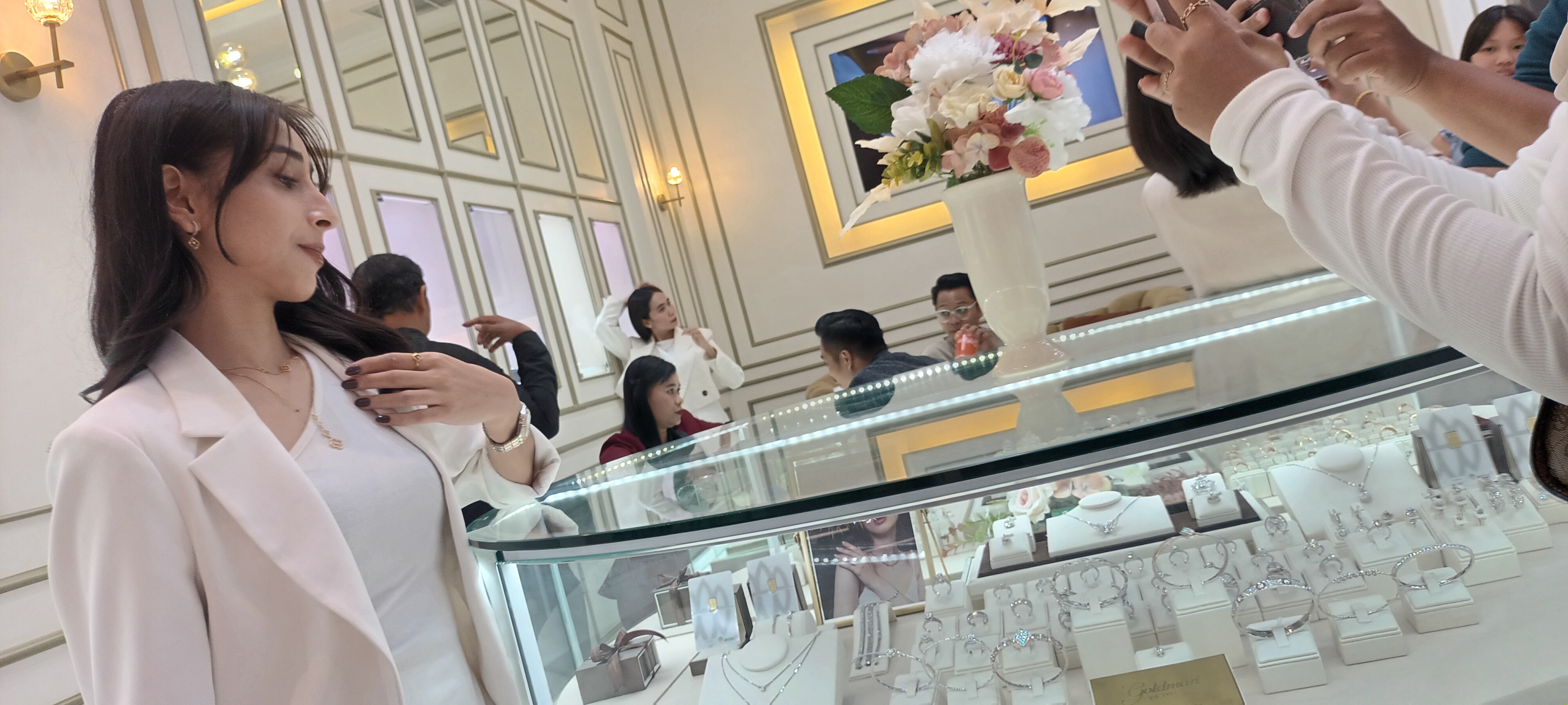 Gerai terbaru ini hadir dengan konsep desain homey bernuansa putih, krem, dan emas, dilengkapi pencahayaan terang yang menonjolkan kilau perhiasan sekaligus menciptakan suasana elegan bagi pengunjung.